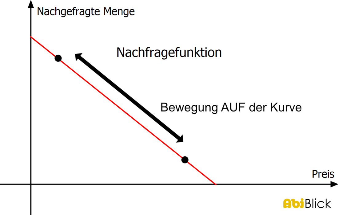 Bei einer Erhöhung des Preises sinkt die Nachfrage. Bei einer Senkung des Preises steigt die Nachfrage. Genauso lässt sich die Formulierung entlang der Nachfrage umformulieren. Das bedeutet: Ändert sich der Preis oder die Nachfrage, erfolgt die Bewegung auf der Nachfragekurve.